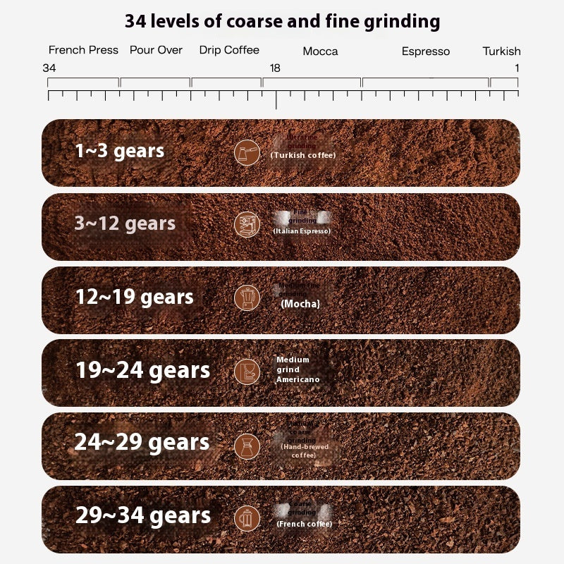 34 Precise Grind Settings: Achieve the perfect grind consistency for any brewing method with 34 adjustable gears, tailored for Turkish, Espresso, Mocca, Drip, Pour Over, and French Press coffee.